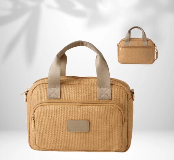 elegante y versátil,el bolso «lina»combina un diseño artesanal con funcionalidad moderna. confeccionado en tejido tipo rafia de tono beige cálido, cuenta con asas cortas reforzadas y una correa ajustable para llevar al hombro o cruzado. Su interior espacioso y bolsillos exteriores con cierre metálico dorado lo hacen tanto para el día a día como para ocasiones especiales.